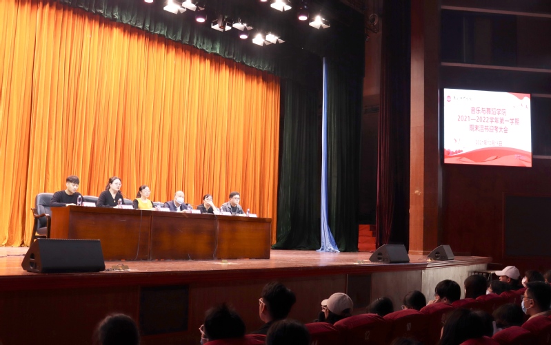 2021年12月16日中午,音乐与舞蹈学院在陈祖昌大礼堂召开期末温书迎考大会暨安全教育大会。参加此次会议的有院党委书记苏国柱、党委副书记兼纪委书记胡秋娇、教务科科长封辉、辅导员张甲玉、辅导员李祖阳和全体学生,本次大会由学工办主任刘晓莹主持。