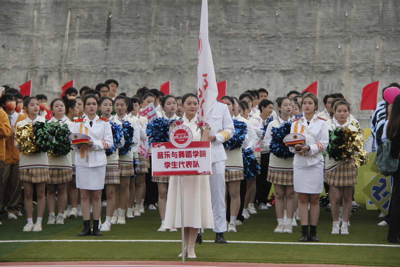 排头的领队手举院旗,踏着漂亮的正步,带领行进队的音舞学子们走向主席台下。南音专业的学子们款款走来,手持南音上四管乐器与下四管小乐器,展现南音的特色风采;音乐学专业的学子们为运动会献出《歌唱祖国》,展现了音乐学专业的良好素养及对祖国与学校的热爱;舞蹈学专业的学子们,迈着轻盈的步伐,为校运动会献出靓丽的舞蹈。随着一句句口号的呐喊,行进队的学子们踏着整齐的步伐,完成了收尾。