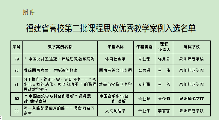 近日,福建省高校课程思政教育联盟公布了第二批课程思政优秀教学案例入选名单,我院吴少静教授主持的“中国音乐史及其名作赏析课程思政教学案例”入选。据悉,全省本次共计163个案例入选。