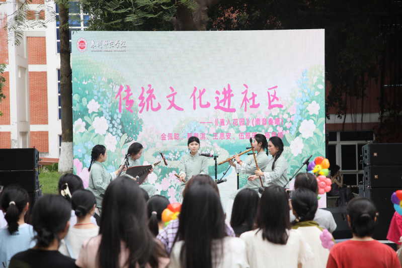 为加强学生对中华优秀传统文化的认同感丰富学生的精神生活4月19日,音乐与舞蹈学院学生宿舍C区举办中华优秀传统文化进学生社区”音乐会,活动现场吸引了线上线下2000余名师生参与。音乐会现场热闹非凡,南音专业学生奏唱南音名曲《直入花园》《春光明媚》等,以欢快旋律传递积极情绪。
