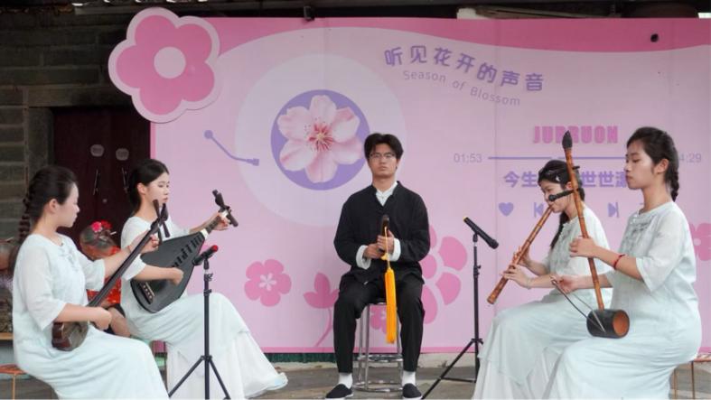8月4日下午,实践队来到蟳埔村与橘若·蟳花携手开展南音公益汇演。实践队成员在百年老榕树下登台奏唱非遗南音,吸引了不少游客驻足欣赏。从《风打梨》(前段)的生动风趣到《直入花园》的欢快活泼,再到《梅花操》的万花竞放,充分展示了我院南音学子的艺术风采,也为古老渔村增添了文化新韵。