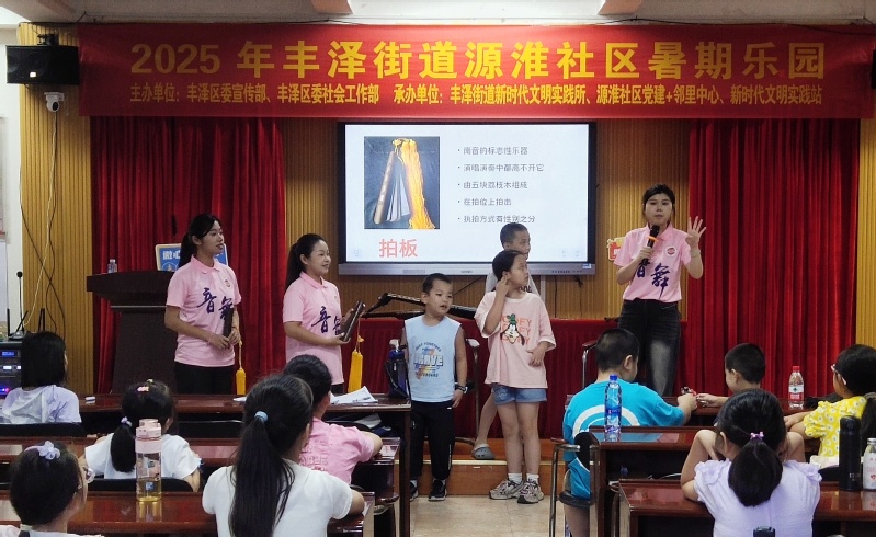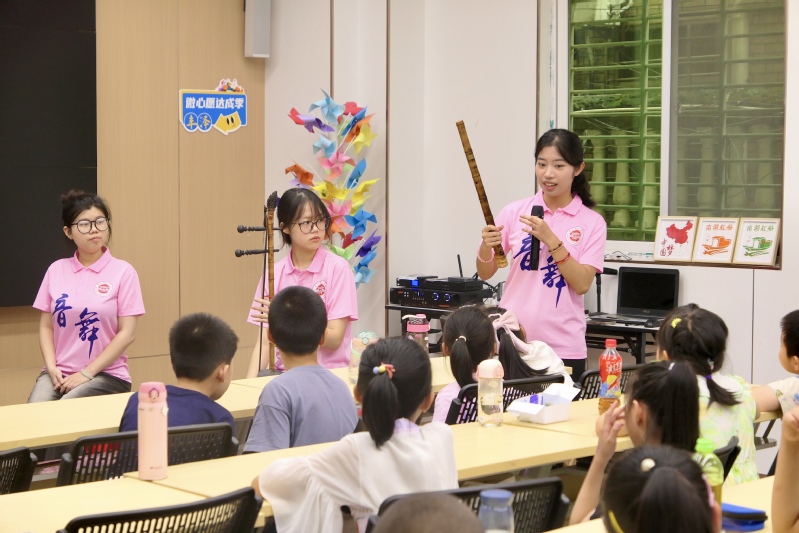 8月4日上午,实践队来到源淮社区开展南音公益课堂活动。实践队成员精心准备多媒体课件为孩子们讲解南音的文化历史,识辨南音工X谱,还展示了琵琶、洞箫等多种乐器,并与孩子们进行现场互动。此外,实践队成员还通过领学《直入花园》等经典唱段,让孩子们更加深刻体会南音的文化韵味。