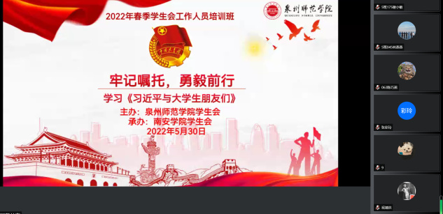 6月3日上午,南安学院学生工作办公室主任刘亦斌带领团委负责人李露燕、党务负责人李国栋、自律会负责人林志斌和民族预科班负责人王文福,对南安学院团委会、学生会和自律会等19名学生干部,开展了2022年春季学生干部培训会。