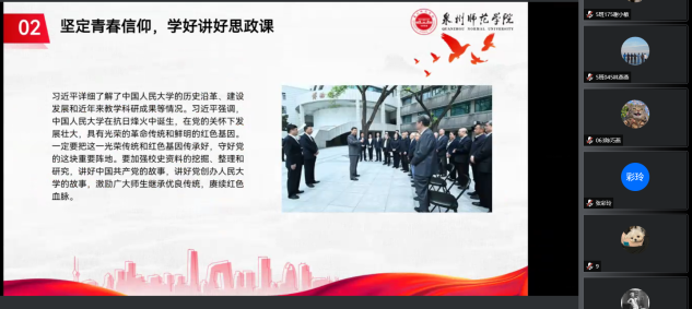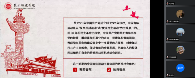 在学习中国青年史运动,林志斌分享了许多五四青年运动中的优秀学生代表,学生会干部们了解了百年前的五四青年运动,在当时社会动荡,民族危亡的情况下,青年伙伴们是如何发挥自己的力量,为社会做出贡献。让学生干部们像注入“强心剂”一般的热血沸腾。今天五四的精神依旧影响着青年学生们,作为学生的代表,学生干部更要把五四精神融入到日常的学习、生活、工作中。
