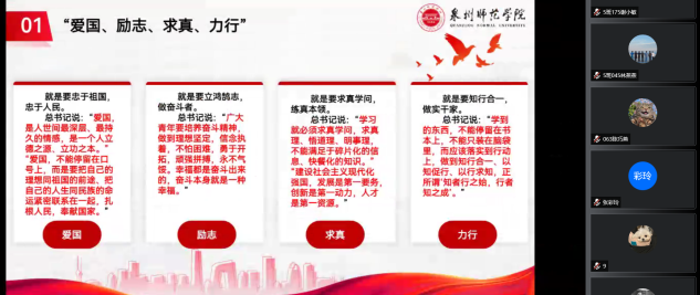 李露燕通过习近平总书记在青年代表座谈会上的精彩讲话,从“谈理想”、“谈价值观”的角度让同学们明白学生干部要先从自身修养出发,拥有良好的精神品德,补足精神上的“钙”,才能更好地为同学们服务,才能从做事的过程中得到锻炼和成长,丰富自己的内心世界。