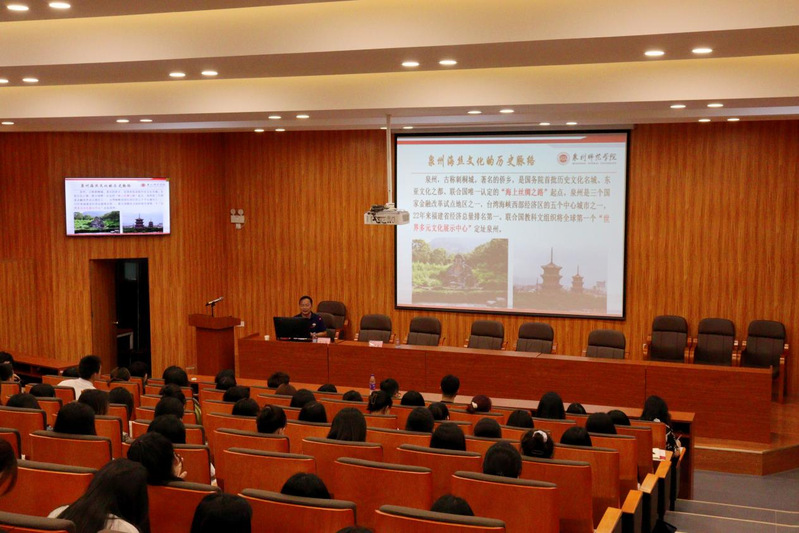 课上,俞文胜从“泉州海丝文化的历史脉络”、“泉州:宋元中国的世界海洋商贸中心”、“国家海洋强国战略”、“振兴泉州海洋经济的思考”、“中欧班列与丝路海运”、“智能无人船泊”六大方面,运用图片、文字等多种形式展开讲述,深入浅出讲述泉州海丝文化的发展路程。从20年申遗之路、泉州城历史、泉州港发展历程、人文之美,到介绍多元文化在泉州的融汇共生。俞文胜提到国家海洋战略,改革开放以来特别是党的十八大以来,泉州的海洋经济不断发展,围绕国家海洋强国战略的理论探索与现实建设一直在推进,泉州聚焦海洋战略、特色发展海洋相关事业取得一系列可喜成果。福建更是率先开启“丝路海运”建设,是落实“一带一路”倡议,建设21世纪海上丝绸之路核心区、促进对外开放和国际交流合作的重要措施。