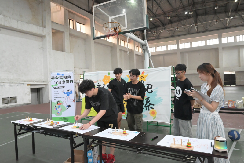 接下来是“汉诺塔”游戏,学生们聚在一起,或出谋划策,或加油助威,比赛者争分夺秒地堆砌一个个圆环。每一次的成功,都会引来围观同学的欢呼,现场气氛热烈而紧张。