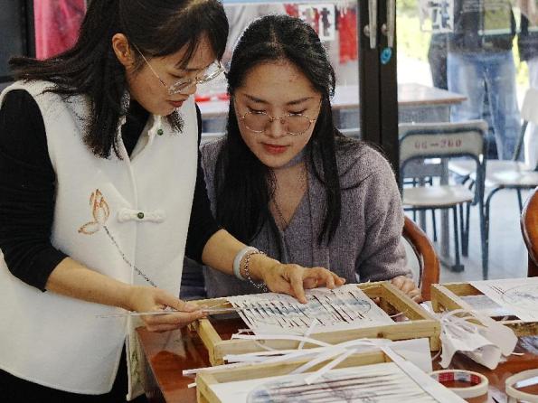 珠绣香囊非遗传承人陈克忍老师现场示范珠绣技法,指导学生们在香囊缎面上缀饰亮片与琉璃米珠。珠绣香囊不仅成为了承载深厚文化记忆的非遗艺术品,更寄托了学生们的美好愿望,为这一传统技艺赋予了新的时代意义。