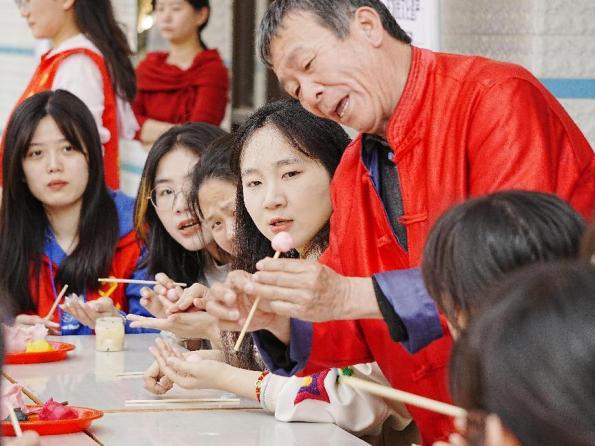 在“妆糕人”制作台前,学生们在张明铁老师的指导下,学习如何用彩色糯米团捏造出栩栩如生的人物形象,并纷纷尝试创作属于自己的“妆糕人”作品。