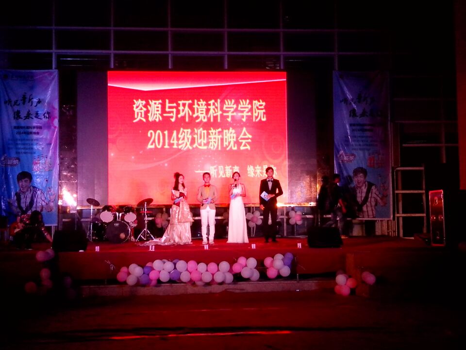 10月24日晚7点,由资环学院主办的2014年迎新晚会在中山广场举行。出席本场晚会的老师有黄联国书记、林静老师、潘伟安老师、、吴惠鑫老师、李金荣老师以及赞助商嘉宾。14级小鲜肉们的精彩表现使整个晚会的气氛达到了最高点,最终在一片欢声雀跃中落下帷幕!