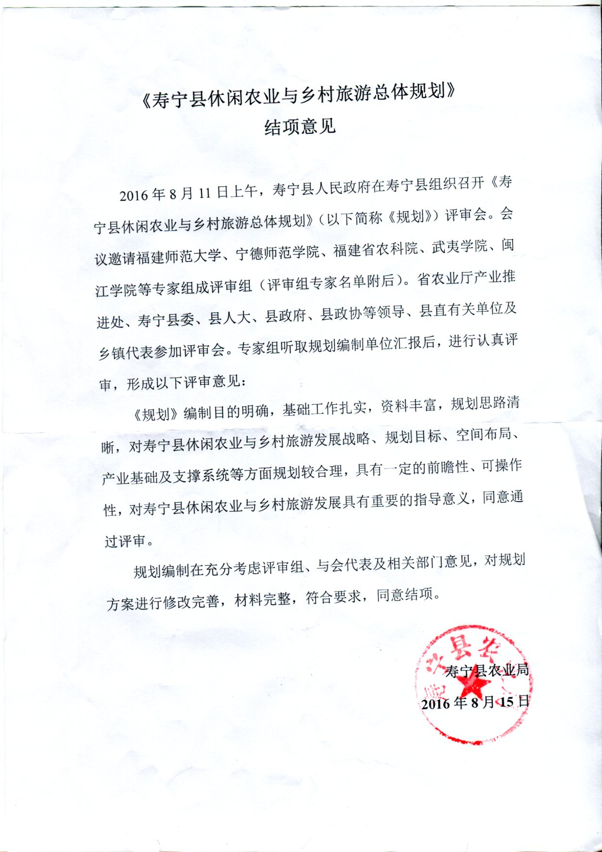评审专家组、领导组共同听取了项目研究成果汇报,审阅了相关资料,经质询和讨论,认为该项目成果目的明确,基础工作扎实,资料丰富,规划思路清晰,对寿宁县休闲农业与乡村旅游发展战略、规划目标、空间布局、产业基础及支撑系统等方面规划较合理,具有一定的前瞻性、可操作性,对寿宁县休闲农业与乡村旅游发展具有重要的指导意义,一致同意该项目成果通过评审会。