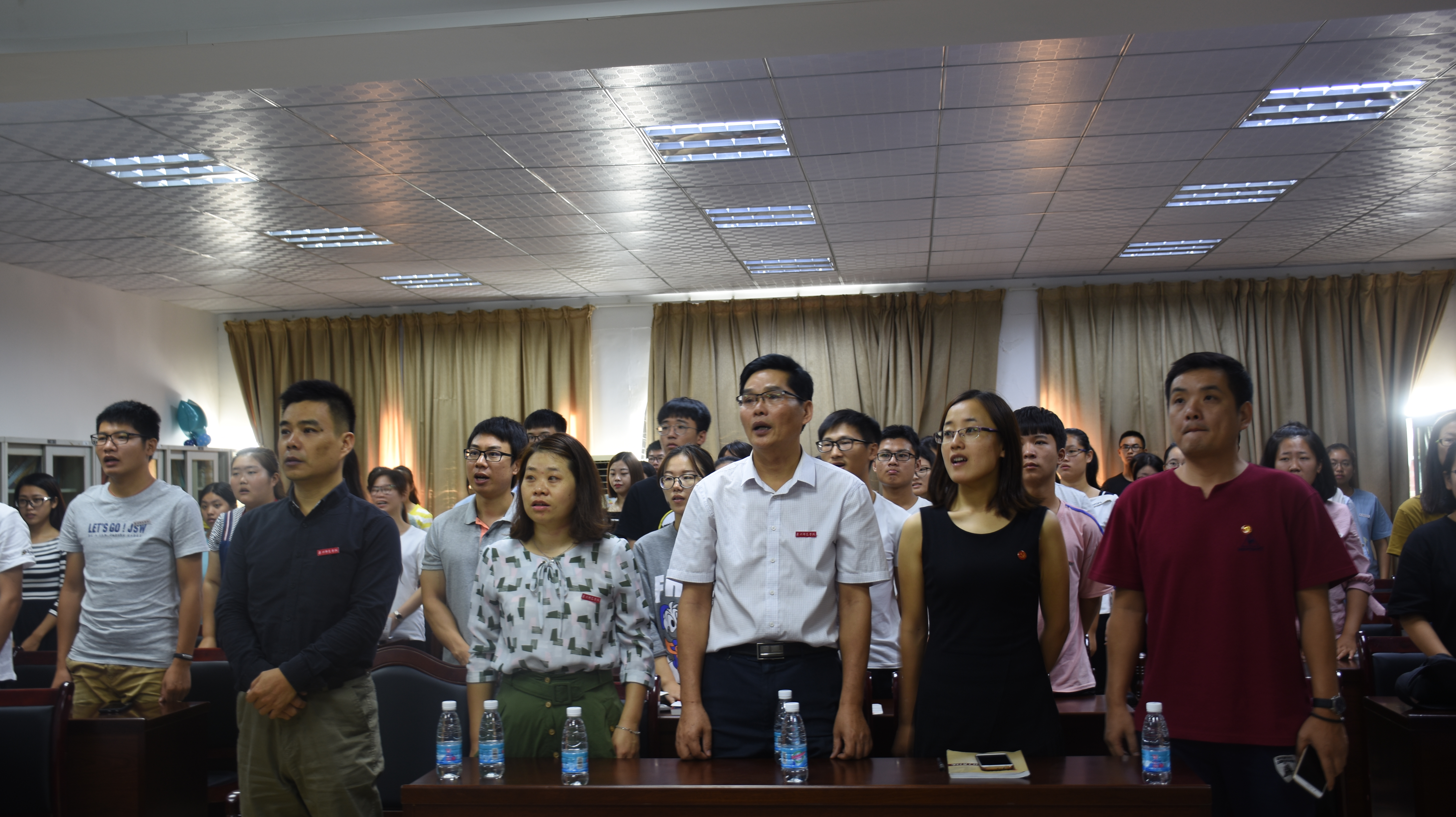 活动现场放置了党旗和国旗,简朴大方,让在场的老师和同学有身临现场的感觉。十九大正式开幕,全体成员起立唱国歌,为已故的国家领导人默哀,党旗之上的党徽与老师和同学们佩戴的校徽相互辉映。随后,全体成员认真聆听和学习习近平总书记的讲话,认真观看十九大直播视频。习近平总书记在讲话中提到“应该抓住我国正处于并将长期处于社会主义初级阶段的基本国情”,“蛟龙、墨子、大飞机等高科技技术不断进步”等一些我国经济文化不断发展的现状以及我国面临的挑战和接下来要实现的目标。
