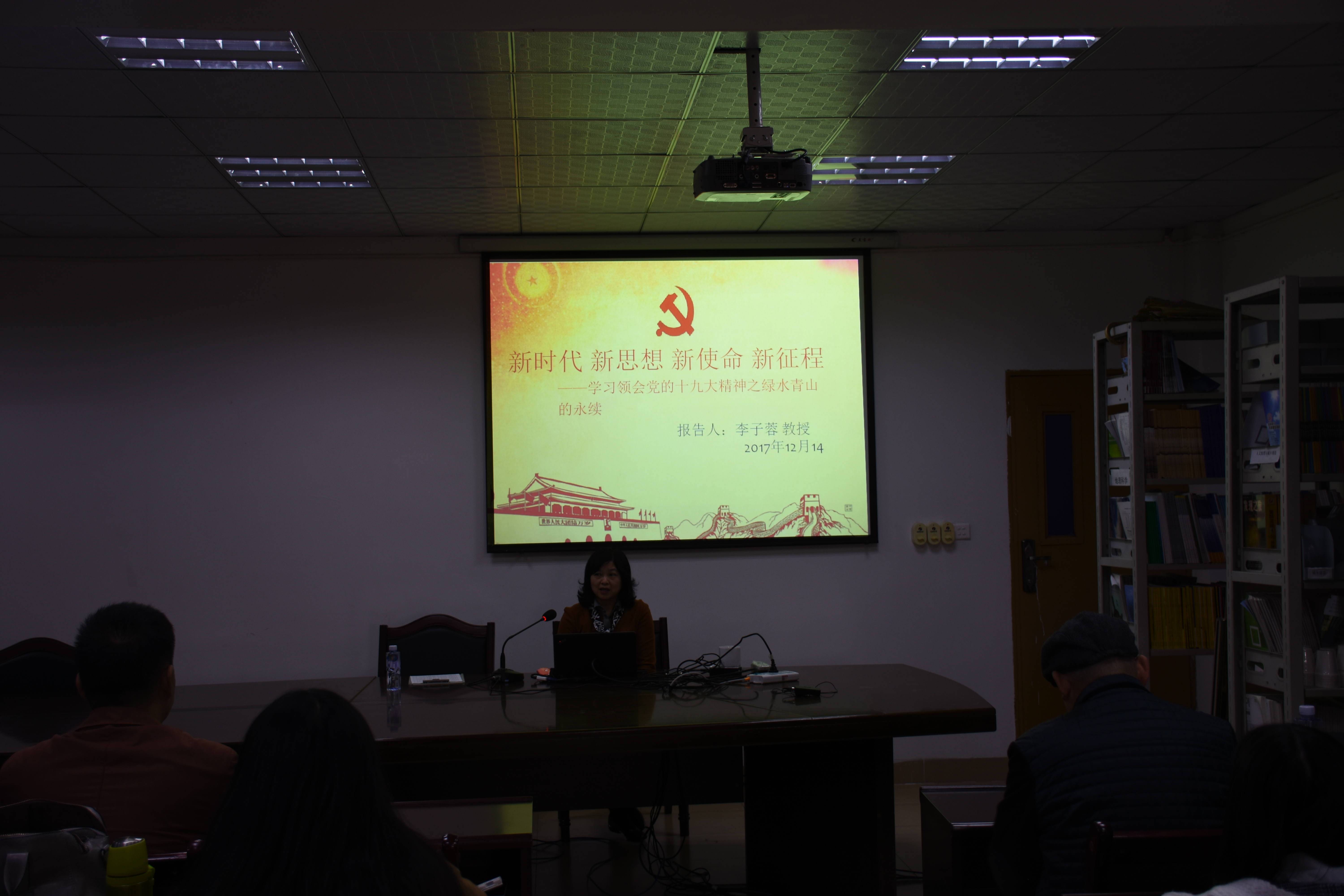 为深入学习党的十九大精神,树立和践行“绿水青山就是金山银山”理论,切实用习近平新时代中国特色社会主义思想武装头脑、指导实践、推动工作,12月14日下午,资源与环境科学学院在邱天生实验楼429会议室开展党的十九大精神学习专题宣讲报告会。学院副院长李子蓉教授作《新时代·新思想·新使命·新征程——学习领会党的十九大精神之绿水青山的永续》专题报告,院全体师生党员及学院读书社成员共80人参加学习。宣讲会由学院党委书记黄联国主持。