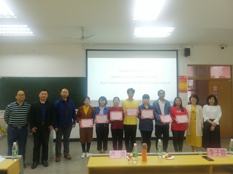 420日资环学院在荣茂楼成功举办了地理教学技能大赛暨第六届福建省高校师范类毕业生教学技能大赛预赛。在李子蓉院长领导下,地理科学专业主任黄初龙教授和16级地理科学班策划组织了此次赛事,由泉州五中卢灵特级教师和我院李子蓉教授、陈大涌、康伟锋、黄初龙等老师组成评委,比赛结果林宇晨同学荣获一等奖,陈恋芹和张惊丽同学荣获二等奖,另有三等奖获得者多名。地理科学专业各年级部分同学们观摩了此次赛事。